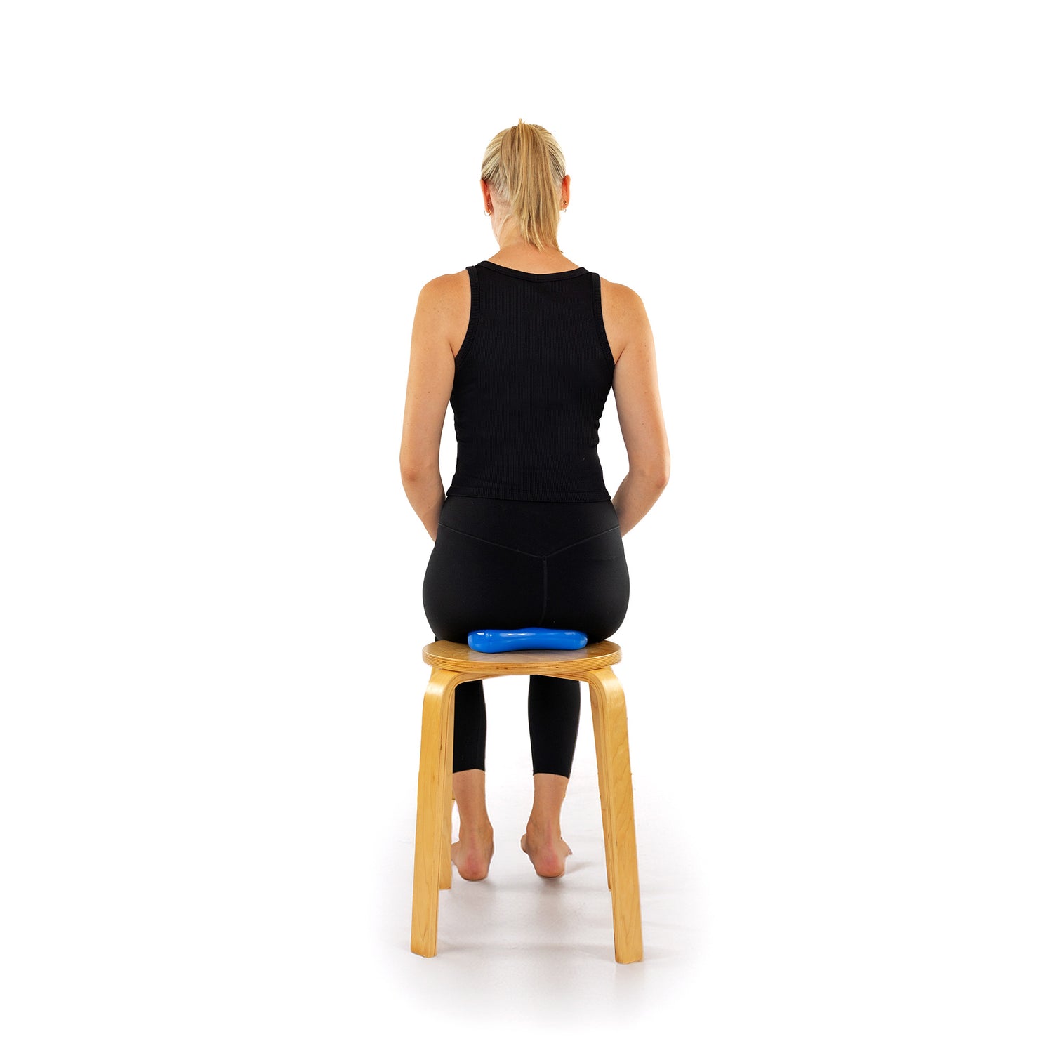 - Such dir einen Hocker und platziere die Faszienrolle unter deinen Sitzbeinhöckern. Am Anfang ist es ratsam, die Rolle nur mit wenig Luft zu befüllen, um die Übung nicht zu anstrengend zu gestalten.